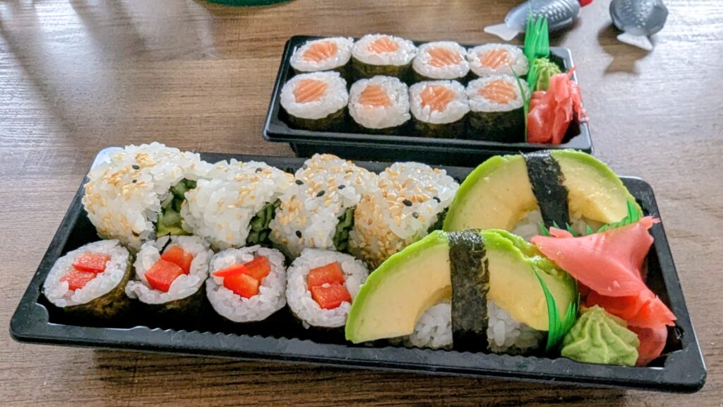 2. Sushi gegessen. Ich wusste nicht, dass es in Mengen schmeckt. Mal 2-3 Häppchen, ok, aber mehr mochte ich nie. Hab aber gedacht ich müsste es mal als komplette Mahlzeit prohieren und heute war es dann so weit es gab rein Sushi. Ich fragte beim Menü schauen noch “Gibts da was dazu, wenigstens ein Salätchen?”.. Ne, gibt's nicht. Und es hat sich gelohnt es durch-zuziehen, meine Güte war das lecker. Morgen wieder. (Nein, nicht ernsthaft. Ich neige bei neuem Guten zur Übertreibung.) Die Sojasoße aus den kleinen Fischförmchen war jetzt nicht der Knaller, aber ich hab doch geschmunzelt, fand die Form niedlich. Mais bon, die Dinger werden wohl im 1000er Paket gekauft und dann dazugeschmissen. Ganz traditionell.